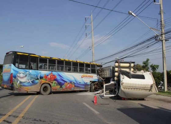 BANGKOK, Oct 16 (NNN-TNA) – A passenger bus crashed into a semi-trailer truck, killing the bus driver and injuring all his passengers, on the Sukhumvit Road in Samut Prakan. The collision occurred in Tambon Bang Pu, at about 8.00 am. Police said, there were about 30 employees of Saha Union…