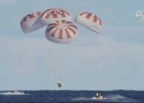 March 10, 2019- This image provided by NASA shows SpaceX’s Dragon capsule carrying a test dummy splashed down into the Atlantic ocean off the Florida coast. It marks the first time in 50 years that a capsule designed for astronauts returned from space by plopping into the Atlantic. Photo courtesy…