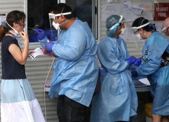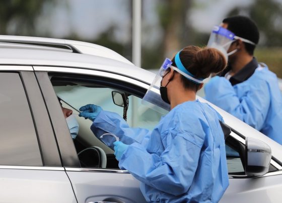 A medical worker collects a swab sample at a COVID-19 drive-through testing site in Los Angeles, California WASHINGTON, Jan 12…