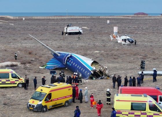 A drone view shows emergency specialists working at the crash site of an Azerbaijan Airlines passenger plane near the city…
