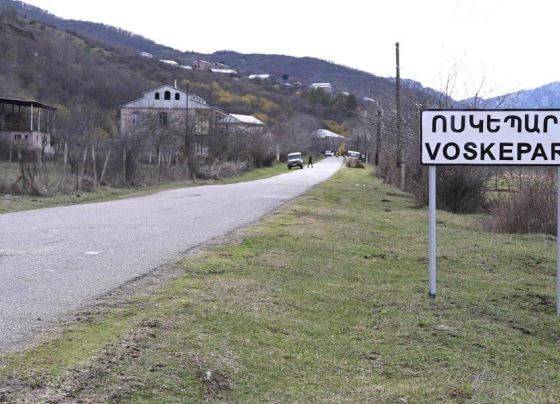 A road sign sits at entrance to the village of Voskepar (Azerbaijani name is Ashaghi Askipara) in northeastern Armenia YEREVAN,…