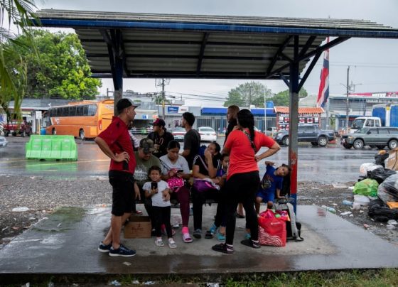 Venezuelan migrants take shelter from the rain at a bus stop on the Costa Rica-Panama border SAN JOSE, Feb 18…
