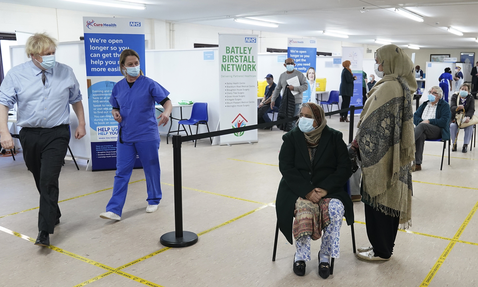 Britain’s Prime Minister Boris Johnson (left) walks past members of the public waiting to receive their vaccine as he visits a COVID-19 vaccination center, the Al-Hikmah Vaccination Center in Batley, England