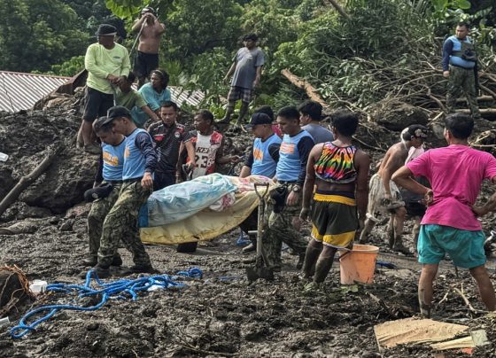 Personal de rescate y residentes trasladan a las víctimas de un deslizamiento de tierra en la provincia de Batangas, Filipinas,…