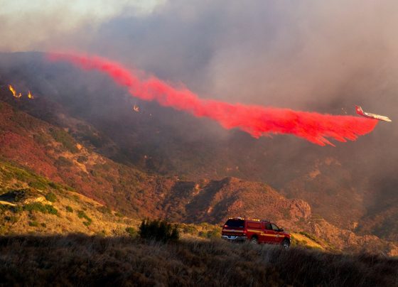 Un avión cisterna arroja retardante mientras el incendio Franklin arde en Malibú, California, Estados Unidos, el 10 de diciembre de…