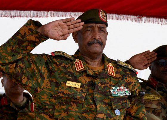 El general sudanés Abdel Fattah al-Burhan saluda mientras escucha el himno nacional después de aterrizar en el aeropuerto militar de…