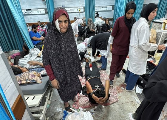 Víctimas palestinas yacen en camas y en el suelo del hospital Kamal Adwan después de que las fuerzas israelíes se…
