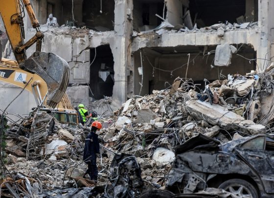Miembros de la defensa civil y rescatistas trabajan en el lugar de un ataque israelí en el barrio de Basta,…