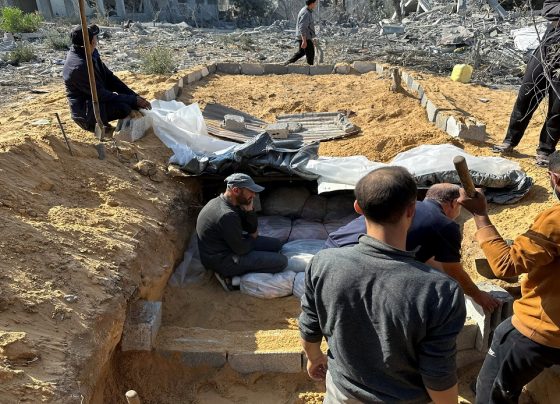 La gente entierra los cuerpos de los palestinos muertos en los ataques israelíes en una fosa común en un patio,…