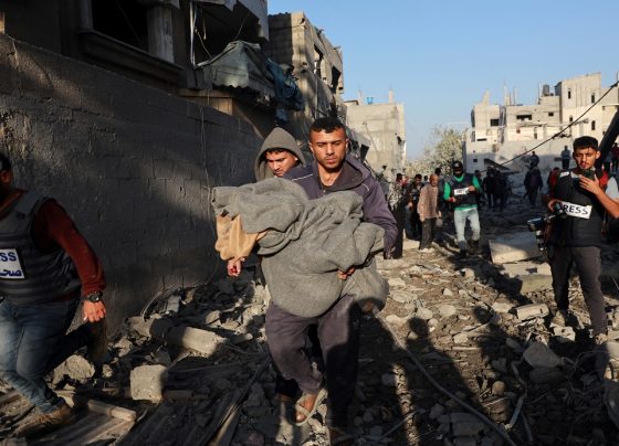 Un palestino lleva a un niña después de que una escuela que alberga a personas desplazadas fuera alcanzada por un…