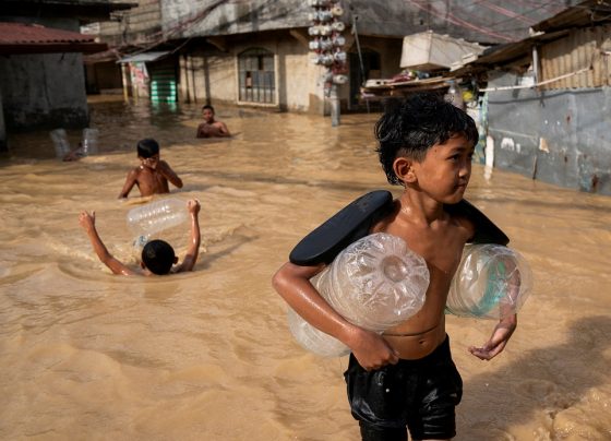Los niños juegan en una calle inundada tras el paso del súper tifón Man-Yi, en Cabanatuan, Nueva Ecija, Filipinas, el…