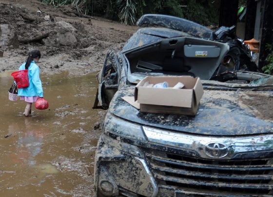 Una niña camina en el lugar de un deslizamiento de tierra causado por fuertes lluvias en la aldea Semangat Gunung…