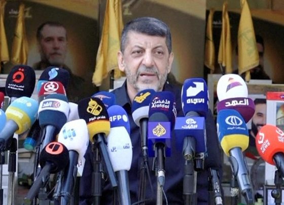El jefe de la oficina de prensa de Hezbollah, Mohammad Afif, habla durante una conferencia de prensa en Ghobeiry, Líbano,…
