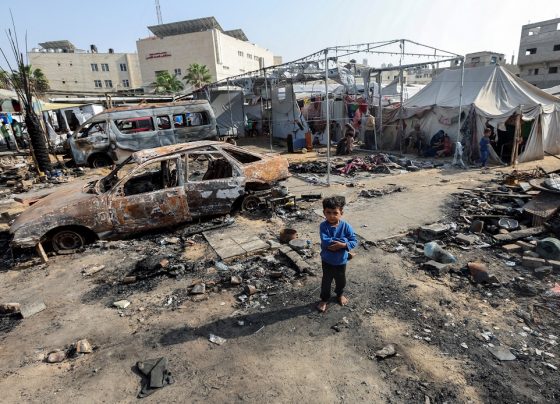 Un niño observa el lugar de un ataque israelí contra las tiendas de campaña que albergaban a personas desplazadas en…