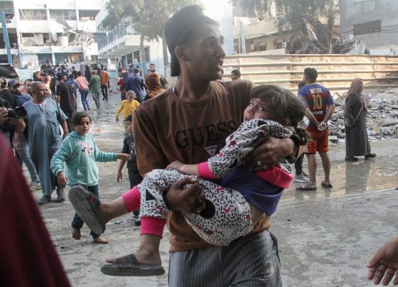 Un palestino lleva a un niña después de que una escuela que alberga a personas desplazadas fuera alcanzada por un…