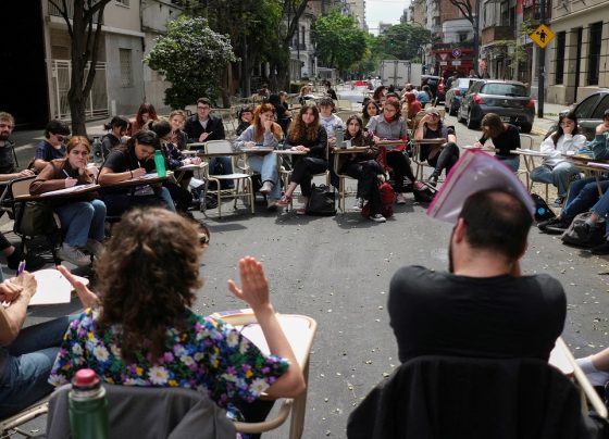 Estudiantes de la Facultad de Filosofía y Letras de la Universidad de Buenos Aires dan clases en la calle para…
