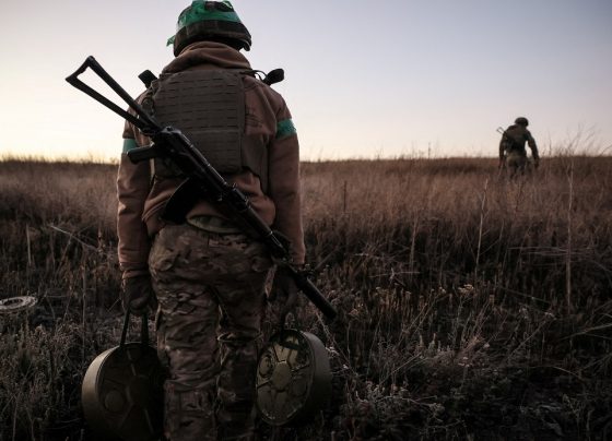 Zapadores se preparan para instalar minas terrestres antitanque, en medio del ataque de Rusia a Ucrania, en las afueras de…