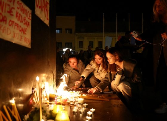 Varias personas encienden velas frente al ayuntamiento de Novi Sad, luego de que el techo de una estación de tren…