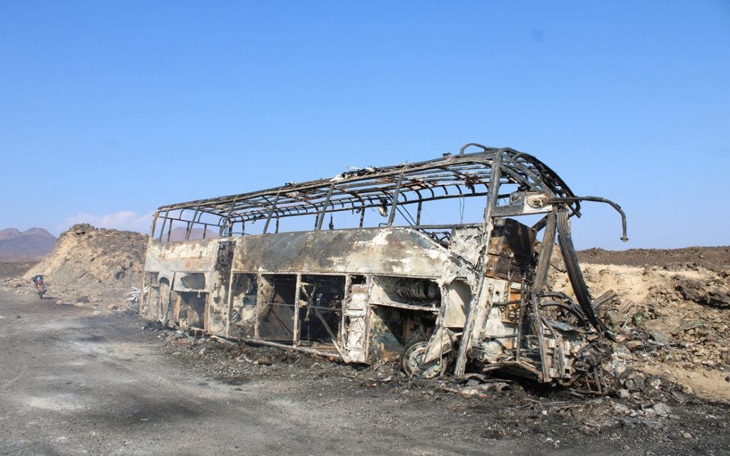 El accidente ocurrió en el peligroso puerto de montaña de Arqoub, en Abyan, cuando el autobús que viajaba desde Arabia Saudí a la ciudad portuaria de Adén colisionó con el minibús, provocando un incendio que engulló ambos vehículos y causó la muerte de 31 pasajeros del autobús y 3 ocupantes del minibús.