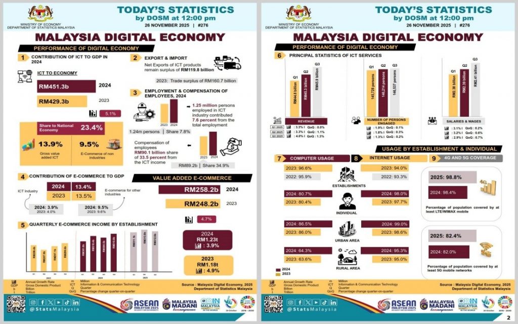 La industria de las Tecnologías de la Información y la Comunicación (TIC) y el comercio electrónico representaron conjuntamente el 23,4 % de la economía nacional en 2024 —RM451.300 millones—, superando los RM429.300 millones de 2023. Este crecimiento fue impulsado por la fabricación de TIC (38,5 %), servicios de TIC (40,1 %), comercio de TIC (15,4 %) y contenidos digitales (6,0 %).