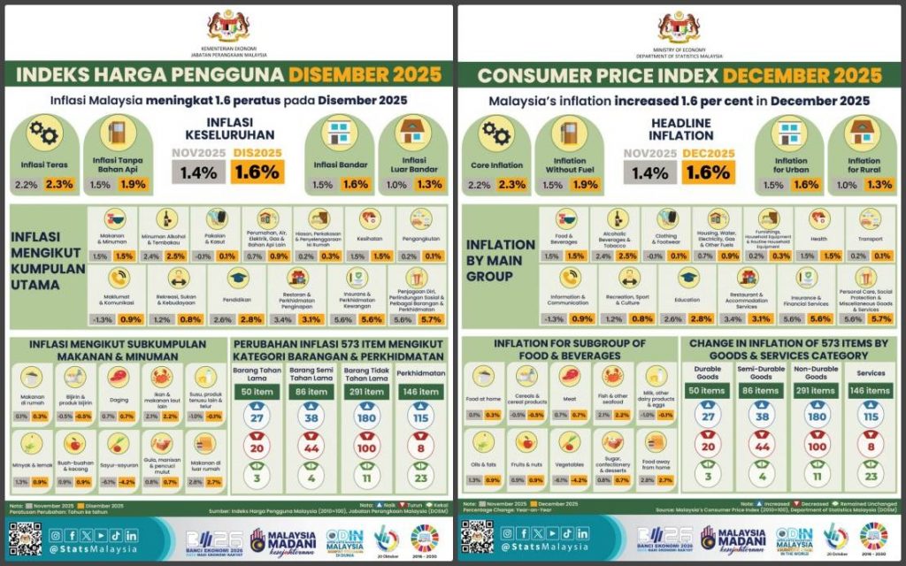 KUALA LUMPUR, 20 ene (NNN-BERNAMA) — La inflación de Malasia aumentó un 1,6% en diciembre de 2025, con un índice de precios al consumidor de 135,5 puntos, en comparación con los 133,4 del año anterior, según informó el Departamento de Estadística de Malasia (DOSM).
